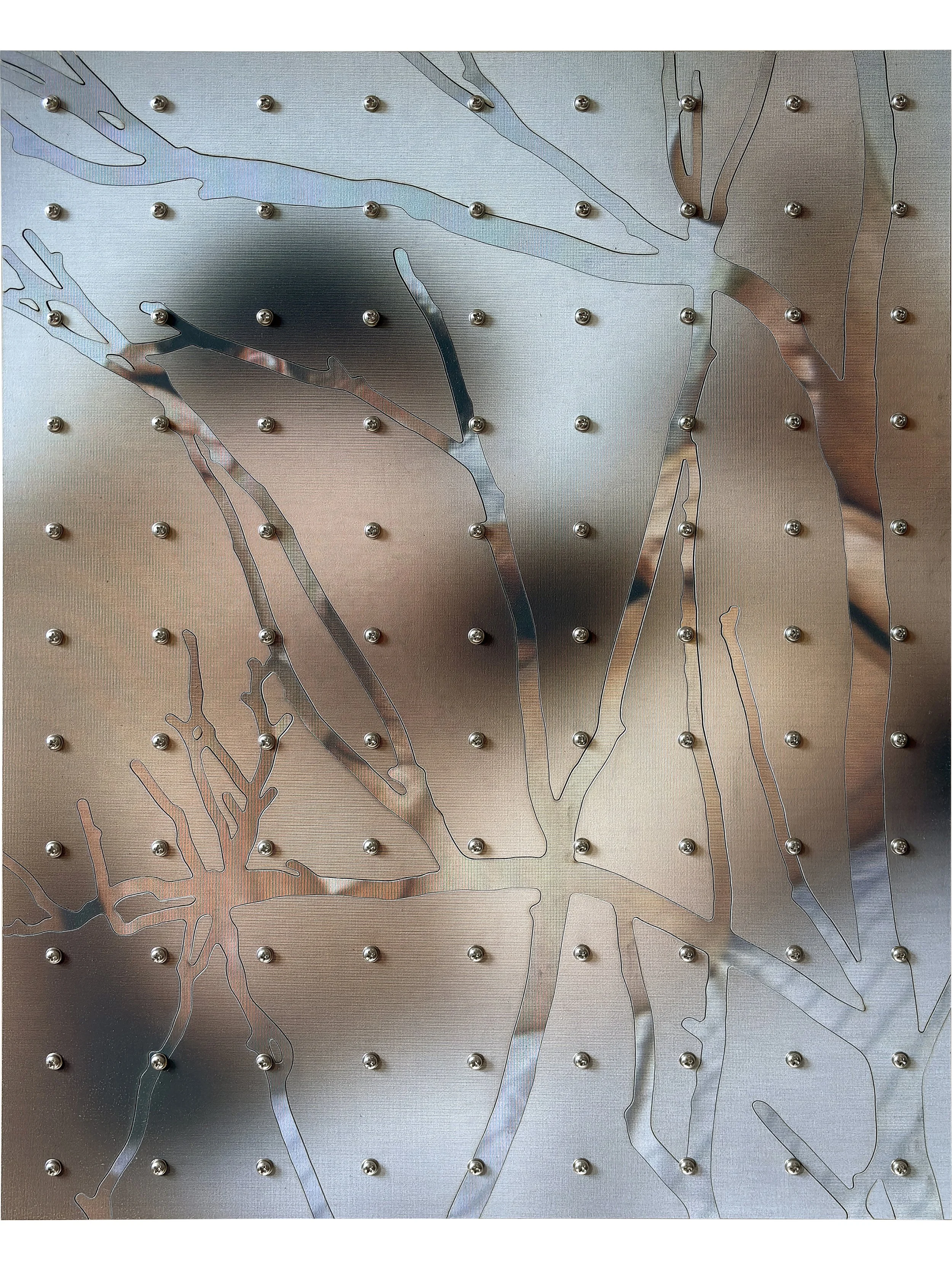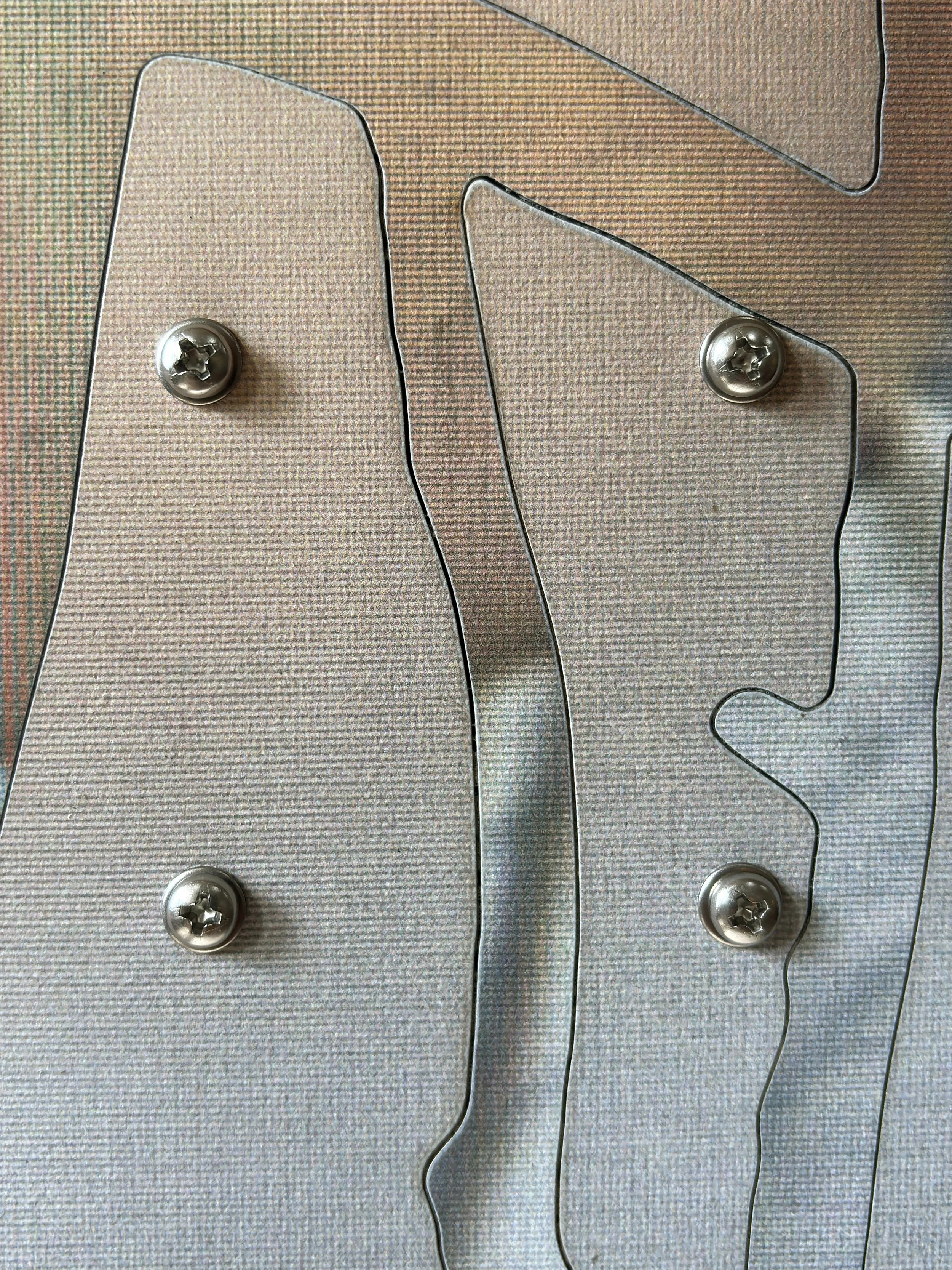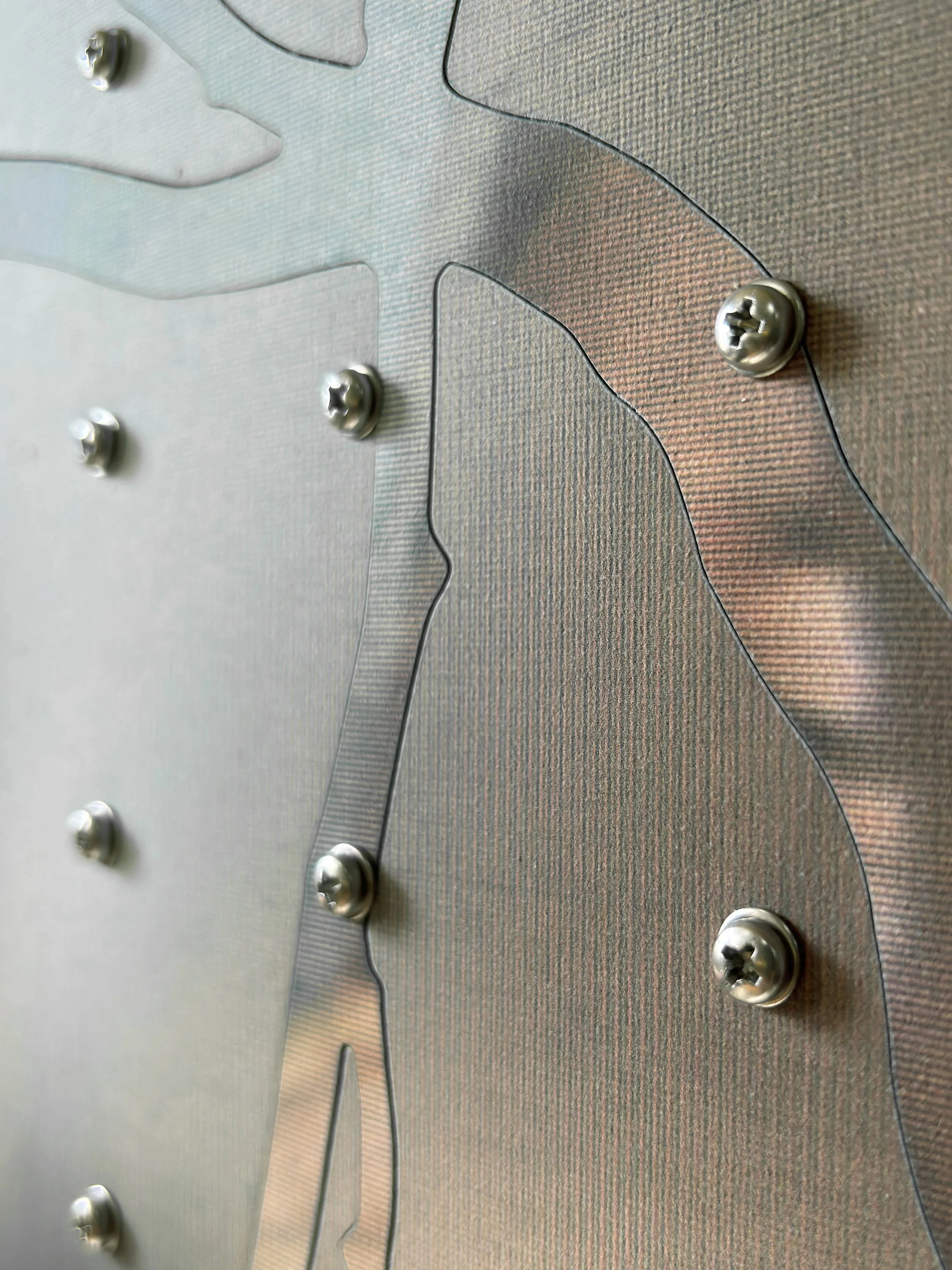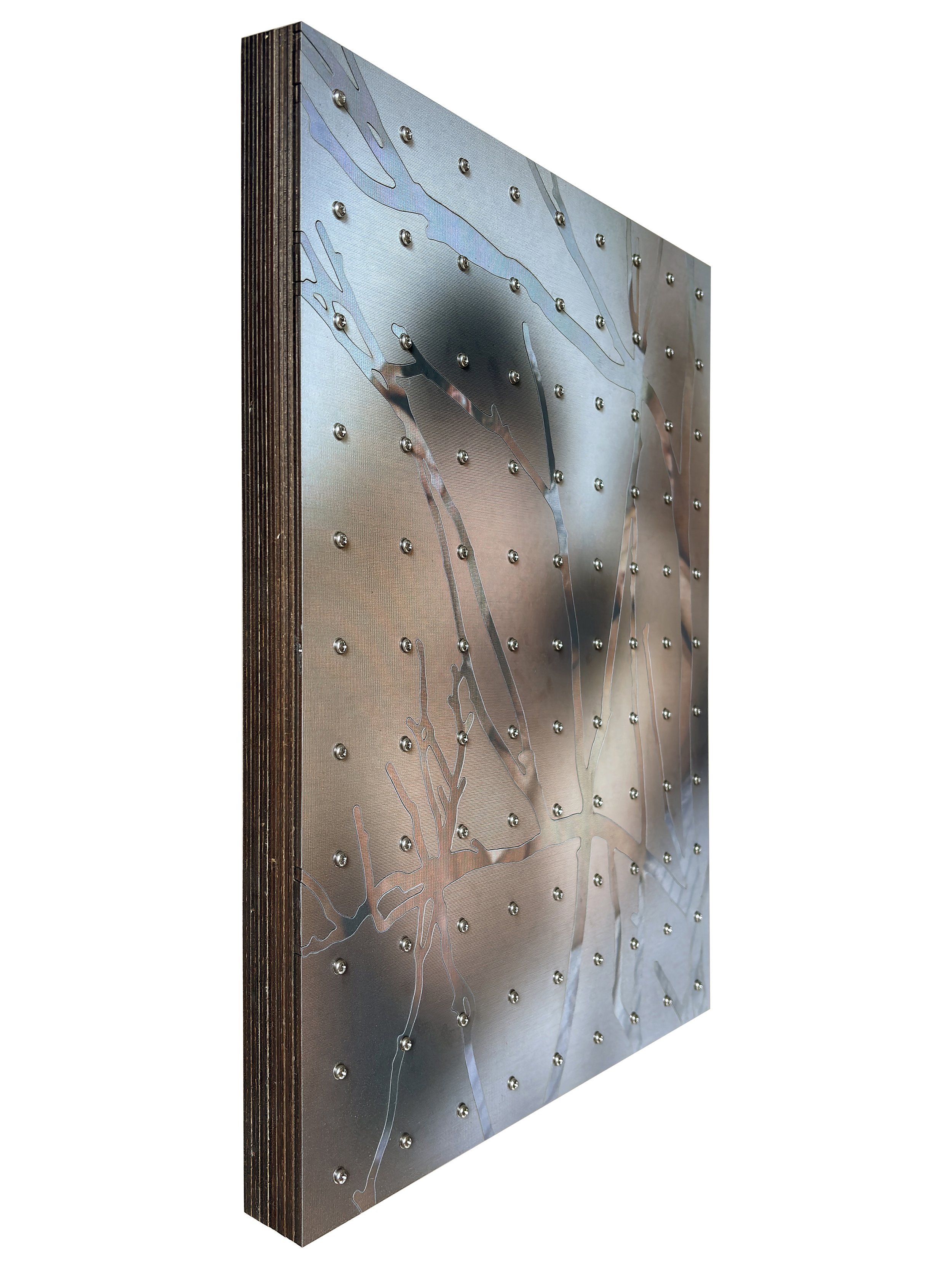 UV print and acrylic medium on birch plywood, stainless steel screws
